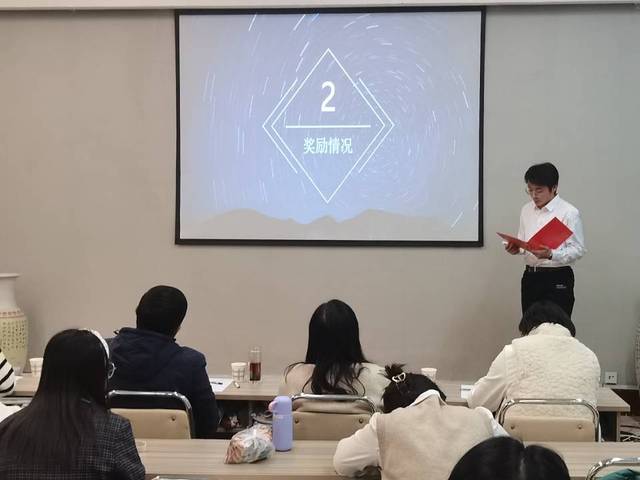 四个年级每个班级都进行了五分钟的展示答辩,班级代表准备充分,信心十足,力图将最精彩、最青春的班级建设风采展现出来。各代表通过抽签决定出场顺序,依照评比规则,对上一学年本班的班级建设尤其是学风建设进行总结和展示。他们用精致得体的PPT、活泼有趣的视频、幽默独特的语言风格展现了班级富有活力、青春向上的班团风采。其中,有的班级展示了上一学年的考勤记录本,有的班级创新班级讲师团,有的班级形成了“三维一体”的宣传阵地,还有的班级展示了特色“家”文化。答辩结束后,刘晓东进行总结发言,对各班在过去一学年取得的成绩表示肯定,并希望各班级互相学习、取长补短,争取把班级建设得更好,共同营造良好的学习风气和学术氛围。
