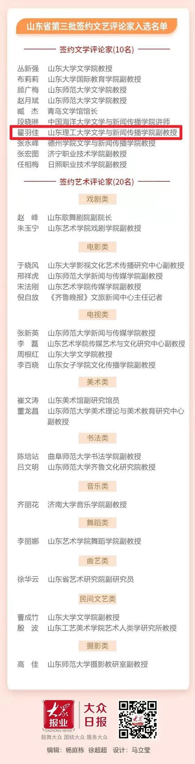日前,山东省委宣传部公布了山东省第三批签约文艺评论家名单,公司经理助理翟羽佳老师入选。省委宣传部本次共评选签约文学评论家10人、签约艺术评论家20人,翟羽佳老师作为签约文学评论家入选。