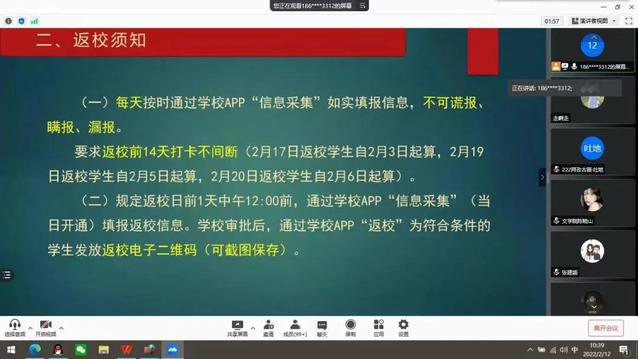 为贯彻落实公司疫情防控工作要求,保障公司2022年春季学期开学工作平稳有序进行,根据公司员工工作部《关于做好2022年春季学期员工返校工作的通知》要求,公司于2月11日召开春季学期员工返校“云”班会,班会由各年级辅导员主持。