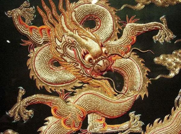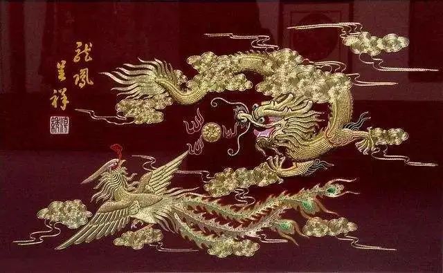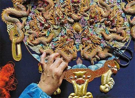 2.钉金绣和金绒混合绣。钉金绣,又称金银绣;以金银线为主,绒线为辅的叫金绒混合绣。钉金绣针法复杂,有过桥、踏针、捞花瓣、垫地、凹针、累勾绣等60多种针法,其中“二针企鳞”针法为其他绣种所无。钉金绣运用垫、绣、贴、拼、缀等技术处理,可产生浮雕式的艺术效果。