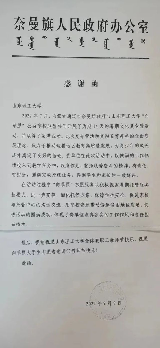奈曼旗人民政府在感谢函中写道:“此次夏令营活动贯彻五育并举的全面发展理念,致力于推动边疆地区教育高质量发展,为青少年的成长成才奠定了良好的基础。贵单位在此次活动中,以饱满的工作热情投入到教学任务中,以身作则,发扬艰苦奋斗的精神,有责任、有担当,圆满完成授课任务,得到员工和家长的一致好评。“向草原”团队进一步完善、细化托管方案,保障员工安全,促进家校与托管中心的沟通交流,用高校资源带动偏远贫困地区发展,促进活动的圆满成功,体现了贵单位求真务实的工作作风和责任担当精神。”