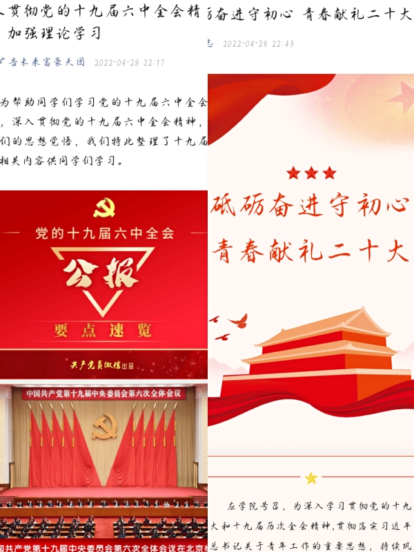 此活动各团支部采用云录制的方式进行,在做好疫情防控的前提下,各团支部积极参与,创作了许多优秀的作品。如中本2001班团支部,线上开展“砥砺奋进守初心,青春献礼二十大”主题团课,从“学习《中共中央关于党的百年奋斗重大成就和历史经验的决议》、领会习近平总书记在深入推动黄河流域生态保护和高质量发展座谈会上的重要讲话精神、联系自身争做五有人才”三个主题展开,在此过程中,通过新闻、人物视频等,让同学们更好的理解。团课结束以后,班级的微信公众号进行积极宣传。广告2002班通过视频录制的方式,抒发了青年员工对二十大顺利召开的祝福。