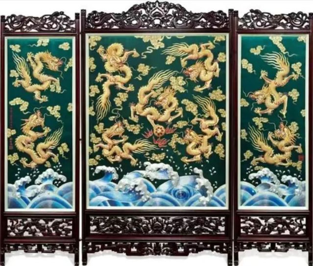 1.绒绣。在各种丝、绸、缎上,以平绣针法用丝绒绣出平的画面;题材多为飞禽、博古,用作画片、挂屏等。