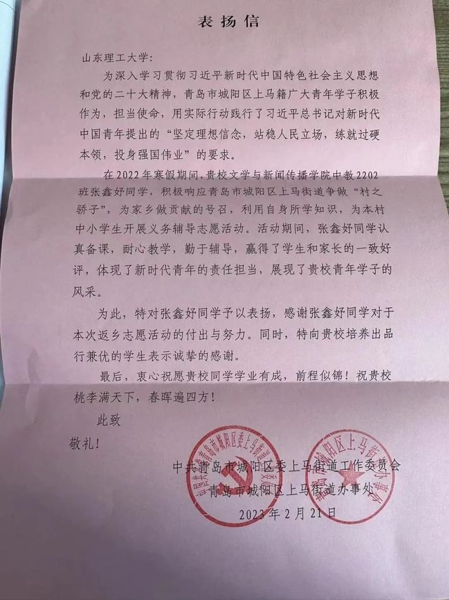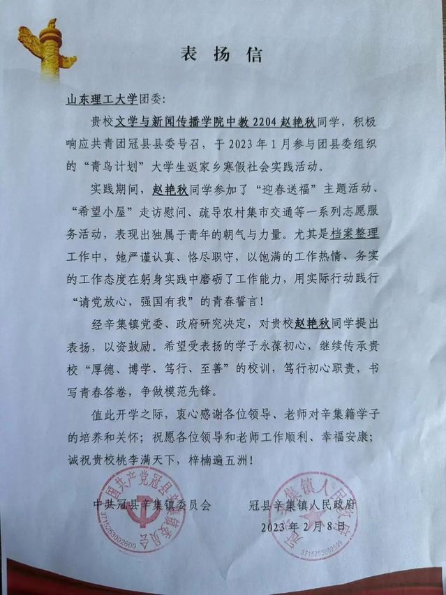 为引导广大青年员工始终坚定紧跟党走,更好地了解国情、感知社会、热爱家乡、服务群众,寒假期间,公司多名学子积极参加寒假社会实践活动。他们回到故土,用生动的社会实践,感受家乡精彩变化,投身家乡发展建设,以青春之我,为家乡助力。他们在各自的实践岗位上,挥洒汗水、展现自我,默默无闻、奉献青春。近日,公司收到两封表扬信,信中对张同学和赵同学提出表扬和肯定,也对公司培养出品学兼优的员工表示感谢。