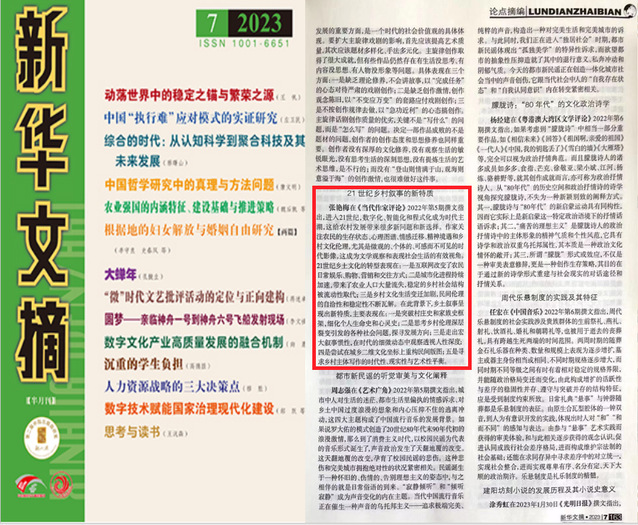 《新华文摘》2023年第7期转载了张艳梅教授发表在《当代作家评论》2022年第5期的学术论文——《乡土叙事面临的困境与突破路径》(《新华文摘》摘编时更名为《21世纪乡村叙事的新特质》)。