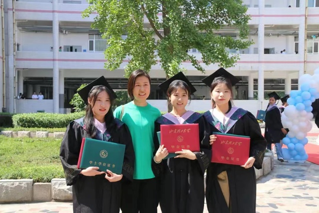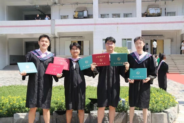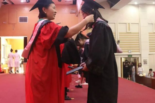 伴随着悠扬的音乐,学位评定委员会成员为毕业生颁发学位证书并拨正流苏,毕业生依次上台领取学位证书,留下珍贵的合影。