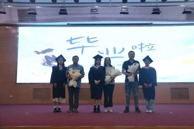 灯光再次亮起,2019级班级导师代表岳守雯、王庆起、李贺上台赠言,表达对毕业生的美好祝愿。岳守雯老师说:“阳光正好,日子悠长,希望各位学子的未来之路宽阔明亮。”王庆起老师也深情回忆起和广告专业员工的点点滴滴,“我们举办过的读书分享会就像在昨天,大家欢笑讨论的样子历历在目。希望同学们在毕业后依旧保持学习的心态,学习身边的人和事,在未来成为更好的自己”。李贺老师也为同学们送上祝福,他说:“感谢我们相遇的这些岁月,也期待与你们有更好的重逢。”毕业生代表上台为班级导师献花致谢。
