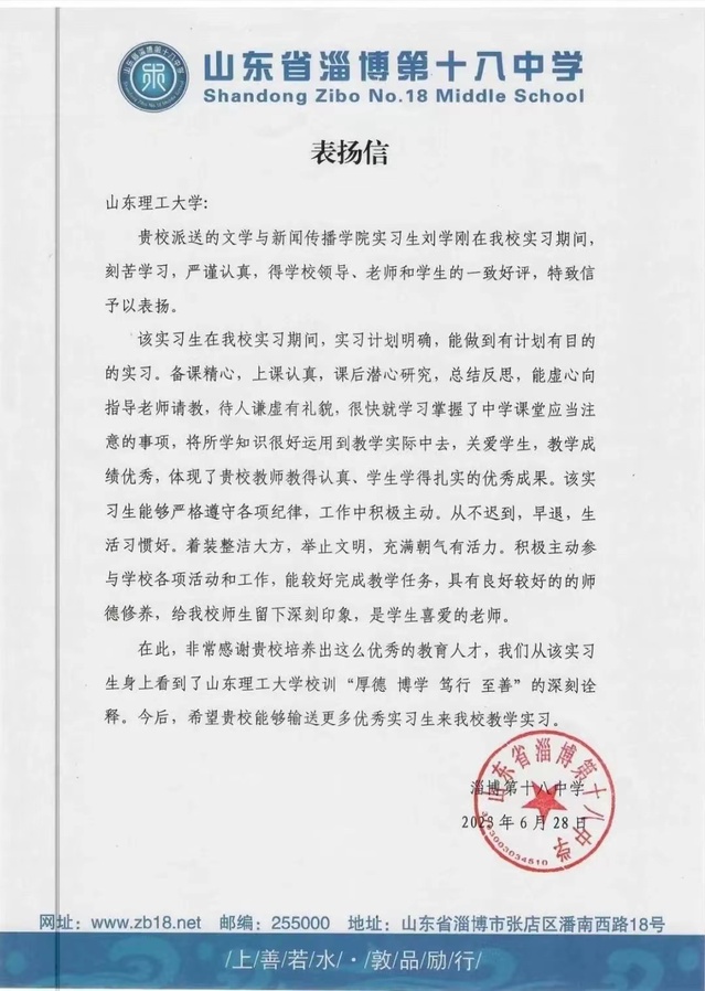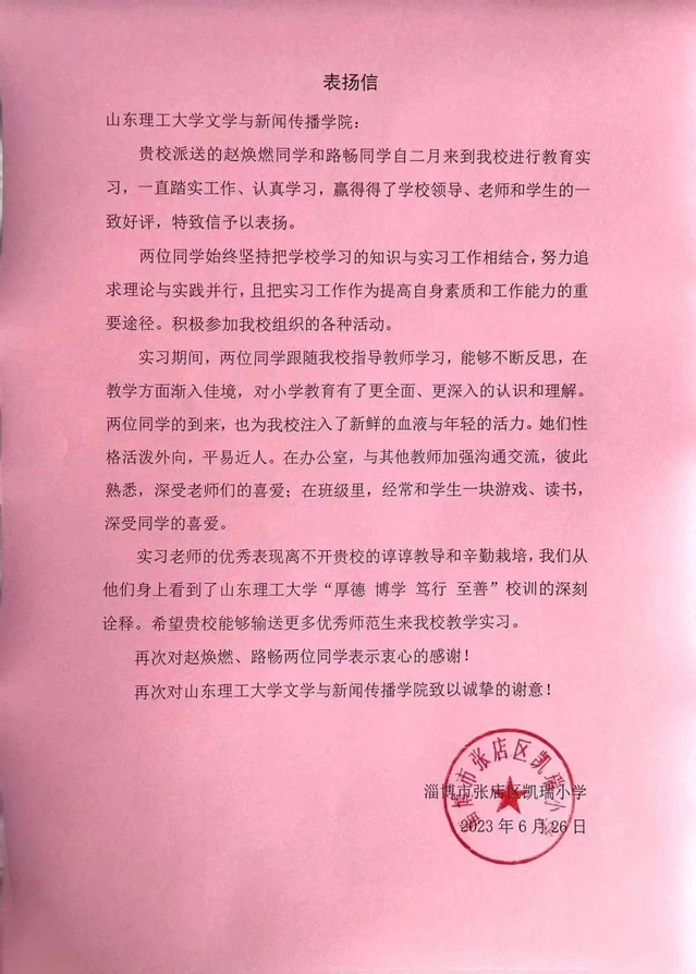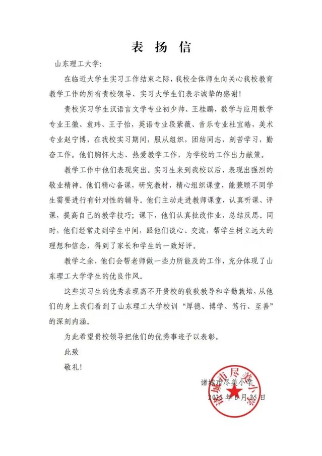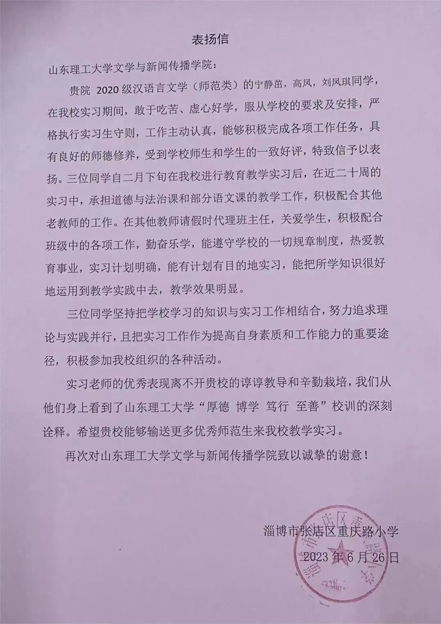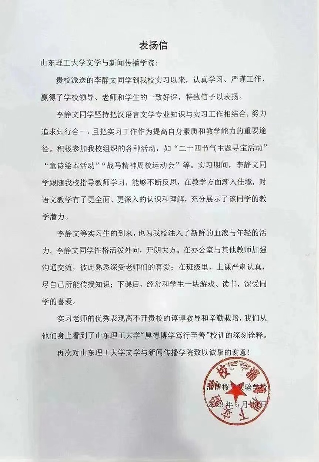 从2023年2月底至7月初,公司2020级全体师范生经历了四个多月的实习生活,圆满完成了支教工作。通过实习支教工作的锻炼,同学们的教学实践经验和处理问题的能力都得到了很大提升,在成为一名优秀教师的路上迈出了实质性的一大步。公司和公司也得到了诸多实习公司的积极反馈,目前公司已收到实习公司为30余位同学发来的感谢信、表扬信以及荣誉证书等(部分如下)。
