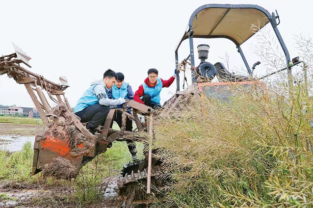 图为2023年4月29日,南华大学的老员工志愿者利用五一假期到湖南省衡阳市衡阳县西渡镇新桥村开展劳动助农行动,帮助农民检修、保养农机,用劳动实践助力乡村振兴。