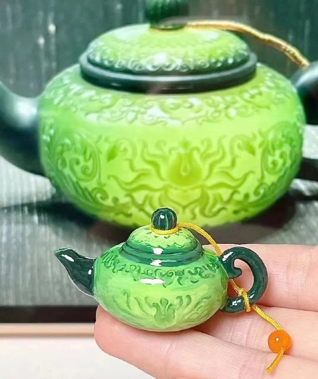 碧玉薄胎茶壶直径9厘米,长14.3厘米,高8厘米。壶形线条流畅、温顺,舒展,已得到写意式的变形,花朵即像莲花,也似佛手,吉祥文静,壶盖以莲叶纹和其他的花边为饰。整件作品端庄、稳重、有灵气,薄胎,薄可透视对面,雕工精湛。