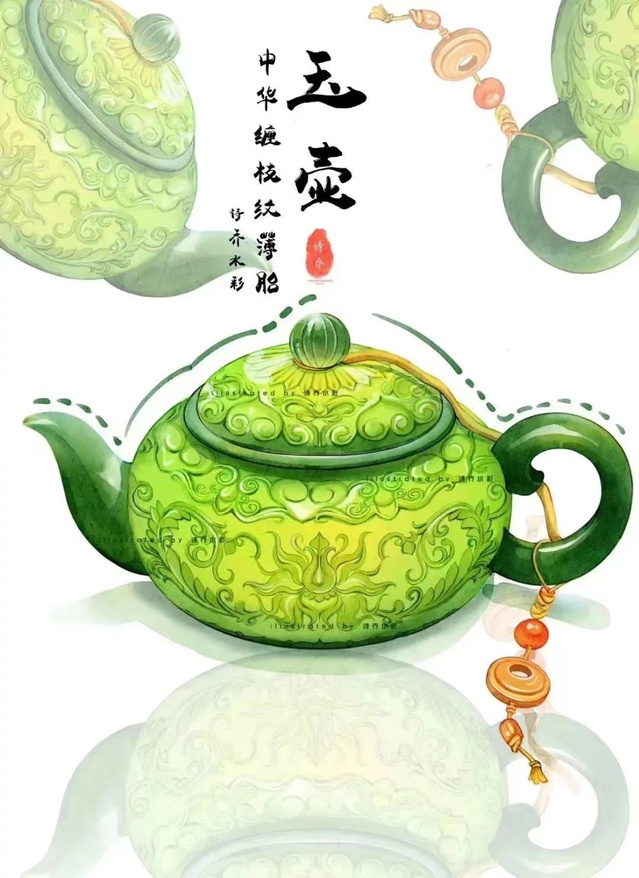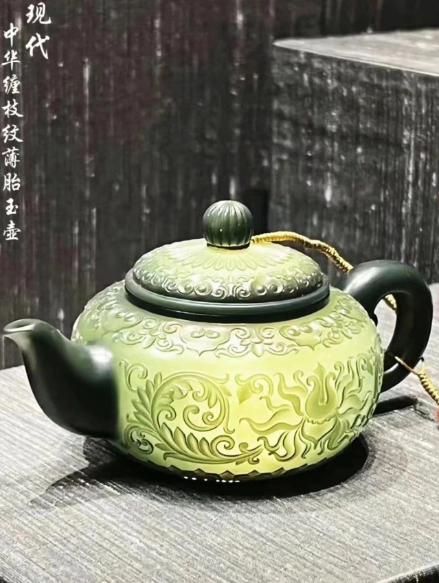 中华缠枝纹薄胎玉壶是汉朝至明朝之间的产物缠枝纹薄作为胎玉壶中之一,属于苏州玉雕范畴,由一整块十三公斤的青海碧玉精雕琢磨而成,整体采用传统中国茶壶形制。线条流畅、温顺、舒展,并且进行了写意式的变形,形似弯身入井汲水,栏高水深,取水者腰弯如虾。寓意学无止境,只有放下身段,不断汲取,才能修得大成。