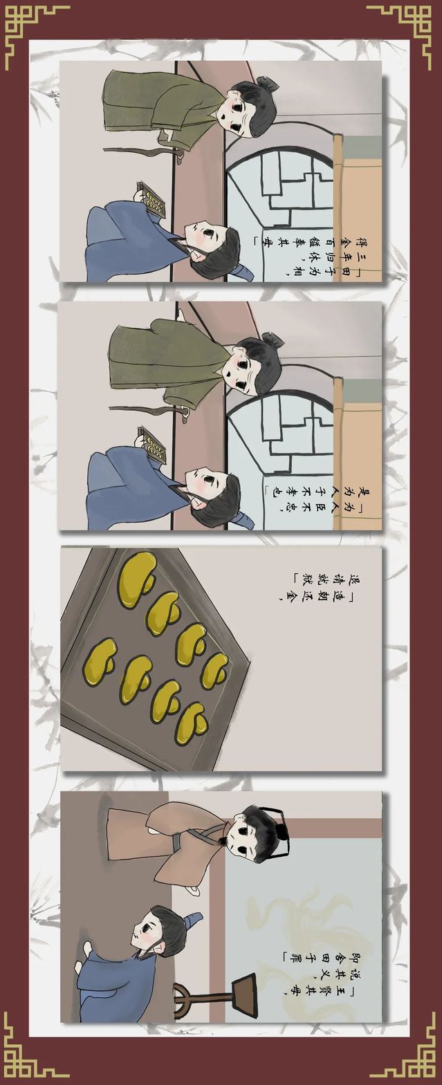 田子为相,三年归休,得金百镒奉其母。母曰:“子安得此金?”对曰:“所受俸禄也。”母曰:“为相三年不食乎?治官如此,非吾所欲也。孝子之事亲也,尽力致诚。不义之物,不入于馆。为人臣不忠,是为人子不孝也。子其去之。”田子愧惭走出,造朝还金,退请就狱。王贤其母,说其义,即舍田子罪,令复为相,以金赐其母。