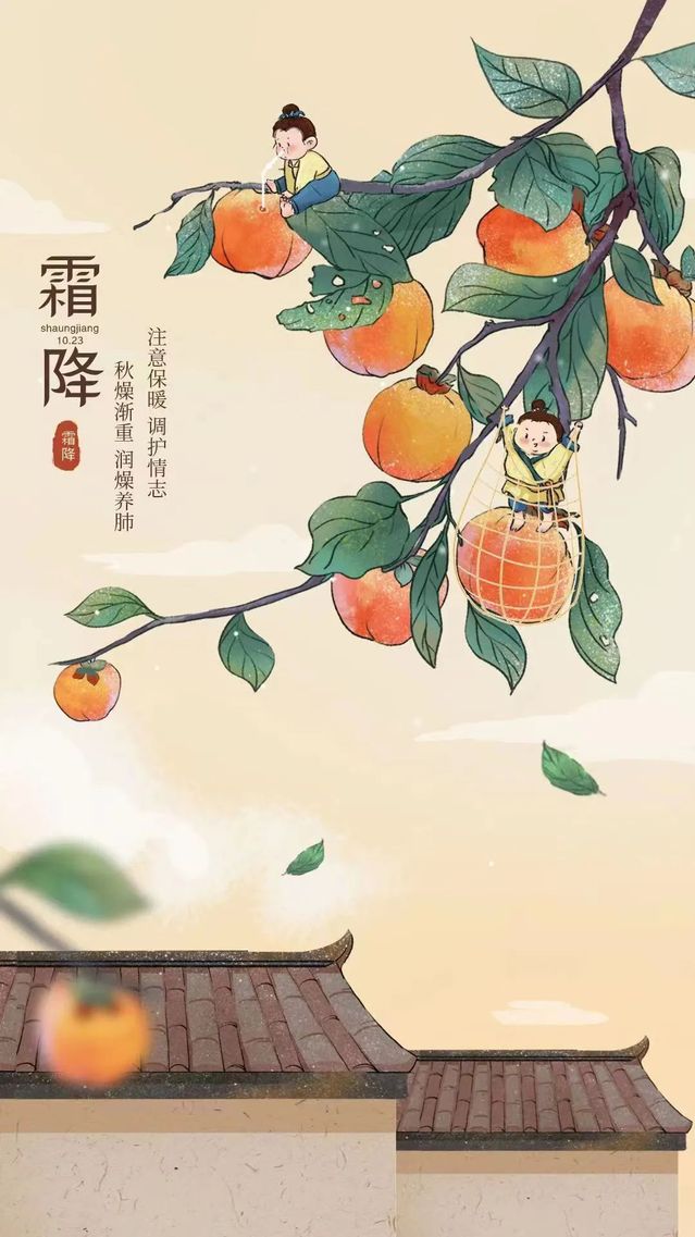 在中国的一些地方,霜降时节要吃红柿子,在当地人看来,这样不仅可以御寒保暖,还能补筋骨。有些地方对于这个习俗的解释是:霜降这天要吃杮子,不然整个冬天,嘴唇都会裂开。