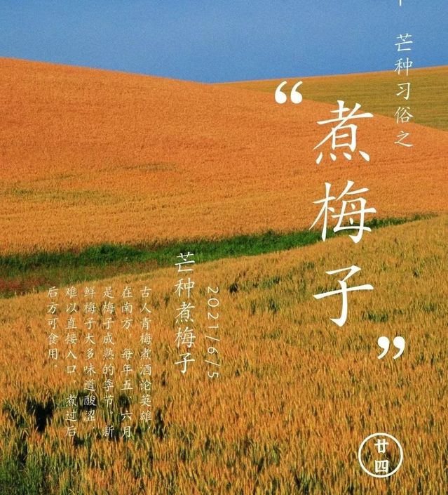 芒种,二十四节气中的第九个节气,夏季的第三个节气,是干支历午月的起始。芒种节气于每年公历6月5-7日交节,此时北斗的斗柄指向东南方位,太阳黄经达75°。芒种在小满和夏至之间,是处在转折期的一个节气。长其夏至,短其冬至,在芒种期间,太阳将逐日靠近它在北半球运行轨迹的最北端,北半球白昼时间最长的日子也就要到了。