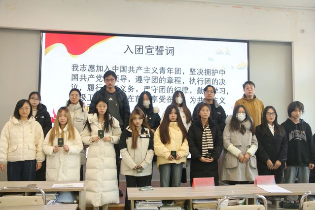 入团仪式在庄严的国歌声中拉开帷幕,全体团员目光坚定、庄严肃穆,带着激动的心情唱响国歌。随后,主持人周钰凯现场宣读新发展团员名单,并带领新发展团员在团旗下进行入团宣誓。新团员们举起右拳,面向国旗,“我志愿加入中国共产主义青年团”,铿锵誓词,字字千钧,彰显着新时代青年的青春热血和积极进取的坚定信念,誓言代表的不仅是一种精神,更是一种责任与担当。