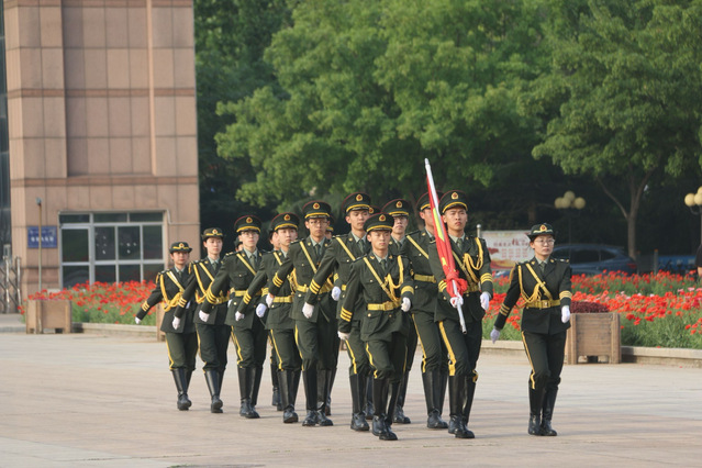 清阳曜灵,和风容与。国旗护卫队迈着整齐划一、铿销有力的步伐护送五星红旗入场。伴随庄严激昂的《义勇军进行曲》响起,全体师生凝望着五星红旗冉冉升起,随风飘扬,向国旗行注目礼。
