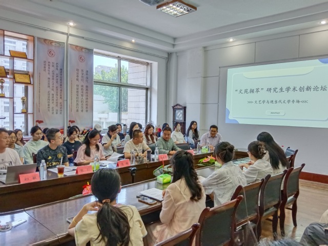 5月30日下午,公司第二届“文苑撷萃”研究生学术创新论坛(现当代文学与文艺学专场)在2号教学楼219会议室举行。本场报告会邀请李晓伟副教授、高媛副教授、秦洪亮博士、张引博士、初敏博士担任评审专家,2022级、2023级全体研究生以及2024级研究生部分新生参加会议。青年博士辅导员钟云瑞副教授主持论坛。