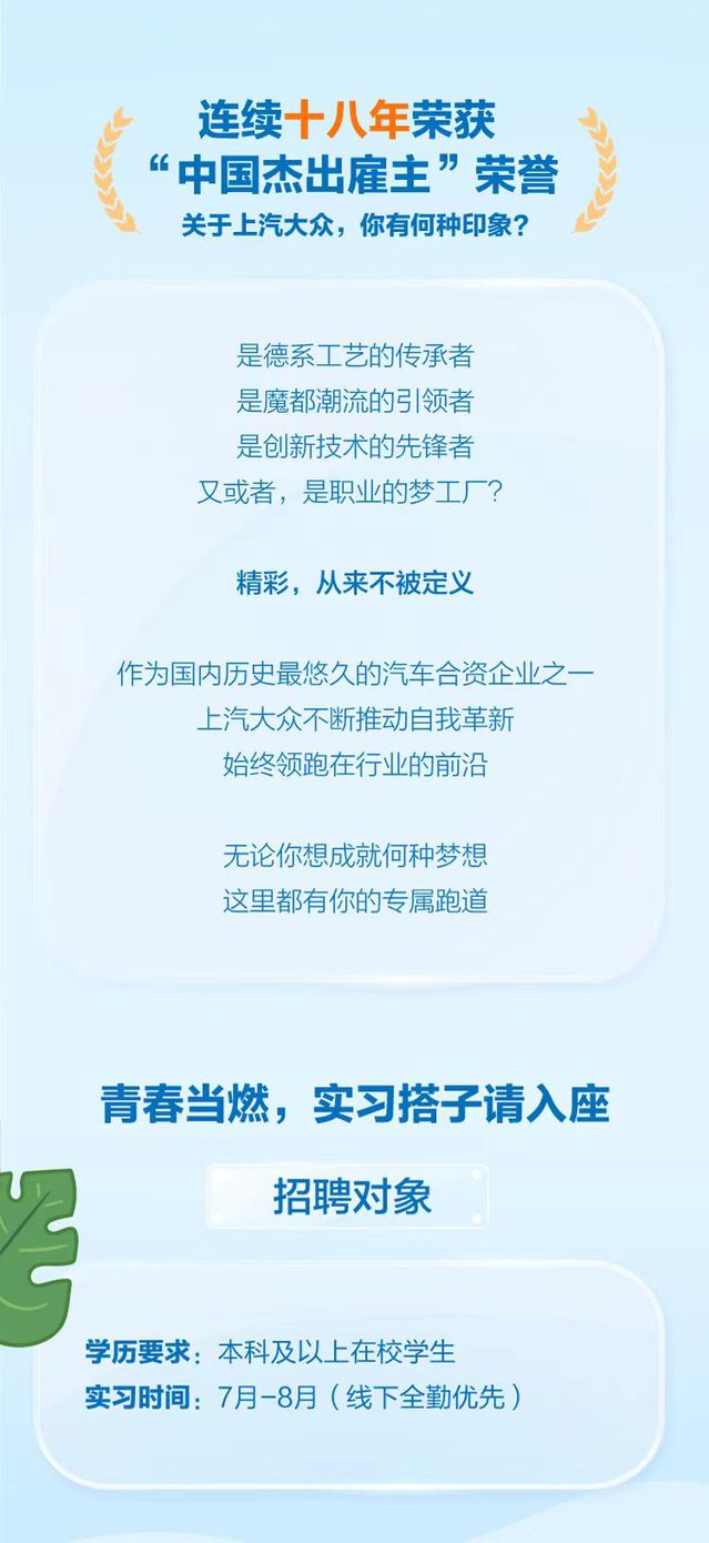 上汽大众2024年暑期实习生招募正式启动