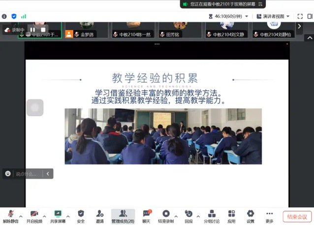 26名实习生分别就自己的见习、实习、研习等活动进行了汇报,展示了4个月的实习经历,并就此发表了自己的实习感悟。他们普遍认为本次实习提高了自己的教学技能和水平,让其对教师这一职业有了新的认识和定位,体会到“学高为师,身正为范”的深刻内涵;进一步认识到专业知识与课堂实践相结合的重要性,并表示要继续加强专业知识的学习,为成为一名真正的优秀的人民教师而打下坚实的基础。