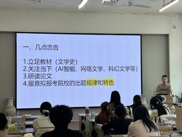 在文艺学专场,初敏老师结合自身考研考博经历,详细讲解了考研技巧及注意事项。他为同学们整理了文艺学方向相关复习资料,并介绍自己的备考方法。
