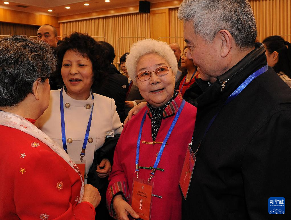 2013年11月29日,中国电影家协会第九次全国代表大会在北京开幕。这是田华(右二)在会议间隙与其他代表交流。