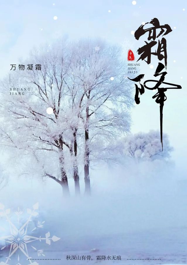 每年公历10月23日前后,太阳到达黄经210度,为“霜降”节气的开始。“霜降”是二十四节气中第十八个节气,也是秋季最后一个节气。“霜降”是一年中有霜期的开始,也是秋季向冬季的过渡。此时节,冷空气活动频繁,气温变化加剧,昼夜温差增大,夜间往往会降至零摄氏度以下,空气中水汽凝华于地表和植被,形成细微的白色冰针或六角形霜花。