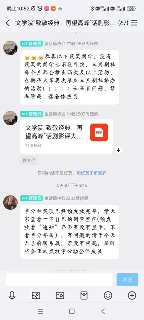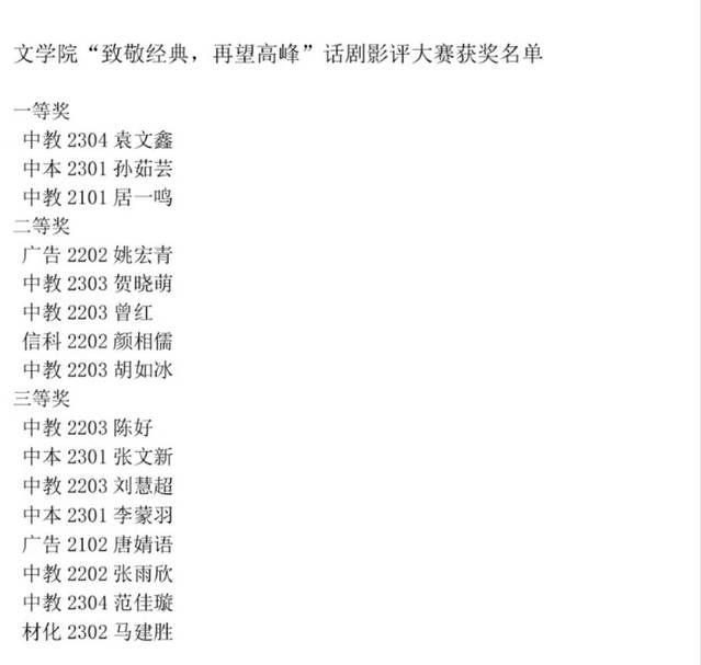比赛期间,参赛者围绕“致敬经典,再望高峰”主题,选择经典话剧进行观影并撰写影评。社团成员组成评审团,对参赛作品进行评选,最终评出一、二、三等奖及优秀奖。获奖作品将在相关平台展示,供广大话剧爱好者交流学习。中教2304袁文鑫《法海求真源》;中本2301孙茹芸《繁漪——话剧史上的荆棘玫瑰》的影评突出。