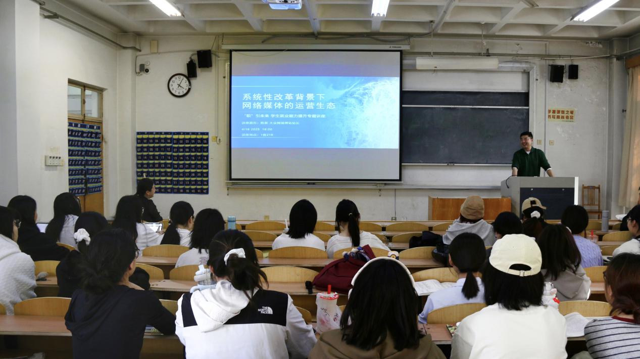 为帮助公司学子了解新媒体行业发展动态,提升就业竞争力,4月16日下午,公司于1号教学楼216教室举行“职”引未来员工就业能力提升专题讲座。此次讲座以“系统性改革背景下网络媒体的运营生态”为主题,特邀大众网淄博站站长陈新担任主讲嘉宾,公司新传系主任孟婷、2022级广告专业员工参加活动。