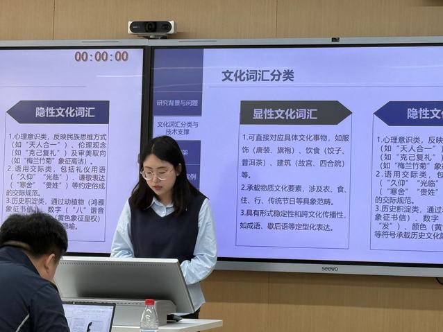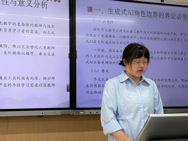 此次会议规模宏大,内容丰富。各高校研究生围绕人工智能与国际中文教育这一主题展开论述。张玉敏的论文题目为“基于中文NLP技术的国际中文教育语言要素教学创新——以语法教学为例”,她将中文自然语言处理技术与国际中文教育语法教学相结合,指出基于规则和神经网络的各类词法、句法和分析工具以及众多中文NLP工具,不仅能保证语法分析的直观性、快捷性和准确性,还能实现职工的个性化学习,增强互动性,从而提高教学效率;王天甲基于输入假说与建构主义理论,探讨人工智能技术赋能汉语文化词汇教学的路径,提出情景化教学、个性化学习、协作化反馈三大策略,并运用虚拟现实、增强现实、多模态交互等技术突破传统教学的局限;赵琳琳在多模态学习理论、AIGC教育应用理论及汉字教学理论基础上分析了AIGC技术在汉字教学的具体应用;潘安琪提出技术赋能需以教学需求为核心,兼顾效率与深度,进而为中文教学提供参考;付佳琪聚焦生成式AI在国际中文教育跨文化教学中的应用,剖析其在学习引导和文化交流中的角色定位;卢绍祎针对泰国教育体系,建构适合泰国本土的中文教学三维框架;孟晞予聚焦中文词汇教学,探讨利用人工智能整合数据资源、模拟跨文化语境这一话题;刘敏敏重点关注利用人工智能生成教材和自动化评测语言材料,助力国际中文公司产品资源开发;范成玲提出利用虚拟形象,通过动态发音口型、情景对话与智能反馈提升语言学习效果。