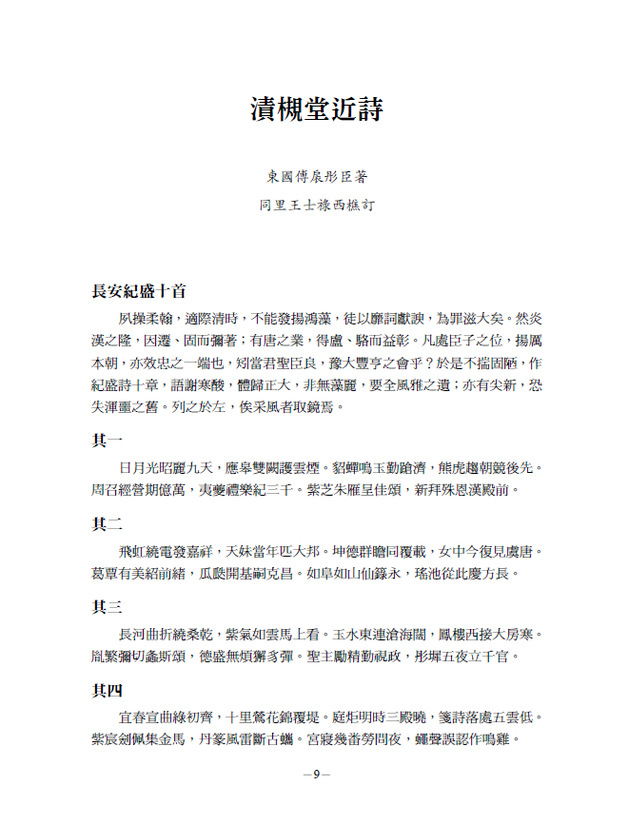清代淄博籍贯文人在诗文创作方面展现出蓬勃的生机,创作出大量诗文作品,极大丰富了清代山左学术。傅扆、袁藩、张廷叙、于桂秀、王佳宾诸人皆有诗集传世。此次汇辑整理《清代淄博诗集六种》,既有整理国故、接续前贤的传统意义,也是深入挖掘传统文化精粹、彰显时代价值的必然需要。清代淄博诗集的整理研究,对于挖掘和弘扬地方文化,深化对中国古代文学和历史的理解,促进文化交流和传承,都具有重要的学术价值和现实意义。