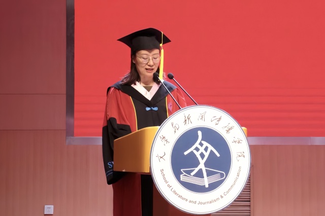 经理张艳梅发表讲话,她首先向圆满完成学业的2025届毕业生致以热烈祝贺与美好祝福。她指出,文学浸润赋予独特人文印记,在技术与价值多元的时代,文学承载的人文精神价值凸显,能帮大家在信息洪流中明辨是非。随后,她以三点祈冀赠别毕业生:一是持守对文字的敬畏与热爱,让人文精神与专业素养、同理心同行,用文字传递温暖;二是承担对社会的责任与使命,在信息生态重塑中,以专业知识与审辨能力,做公共理性的传递者,诠释人文关怀;三是葆有对生活的敏锐与深情,发挥跨媒介实践素养,在数字时代注入思想灵魂与人性温度。同时,她寄语毕业生未来保持好奇心、守护表达自由、善待个体、捍卫原则、相信故事的力量,并鼓励大家带着公司赋予的精神力量,勇敢奔赴广阔天地。