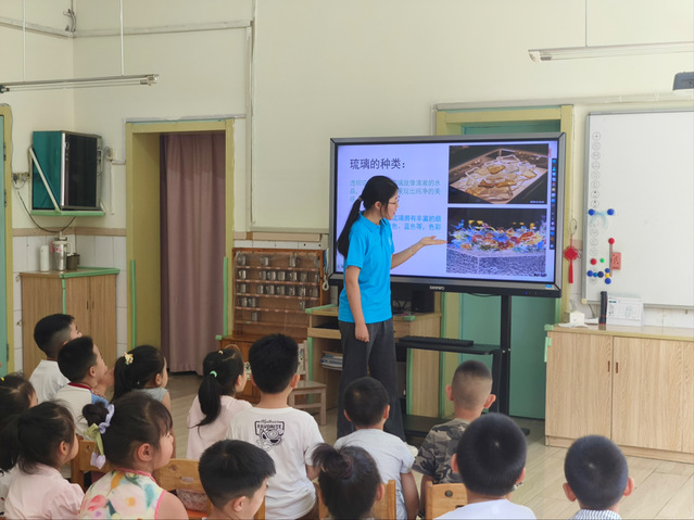 当各色琉璃在阳光下展开,宛若“凝固的彩虹”,瞬间吸引了孩子们的目光。 实践团带来的各色琉璃制品,在光影下流转着梦幻的光泽。成员们用“火中取宝”的故事,生动讲解琉璃的烧制工艺。孩子们踮脚观察,伸手轻触,在零距离感受那份温润与剔透的同时,也深深记住了这份家乡的非遗技艺。