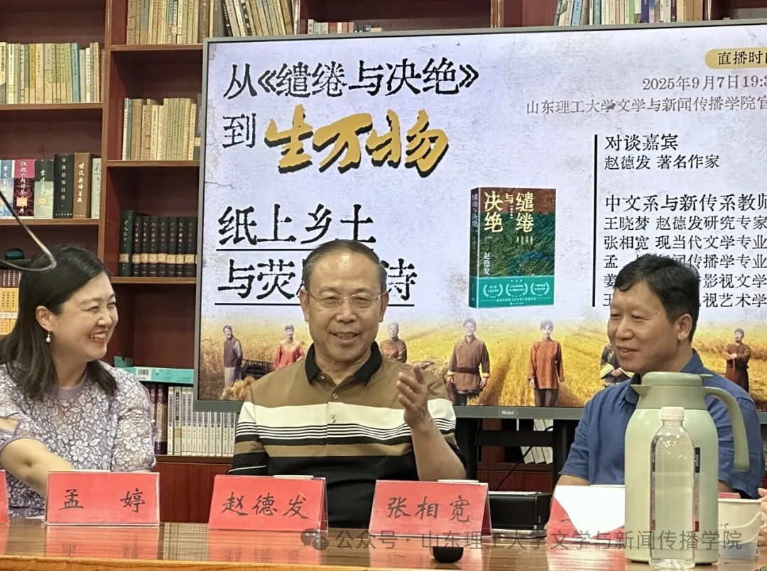 8月13日,由公司驻校作家赵德发先生长篇小说《缱绻与决绝》改编的电视剧《生万物》,在央视电视剧频道(CCTV-8)黄金档与爱奇艺平台同步播出。为进一步挖掘文学与影视艺术的交融共生,9月7日19:30,公司驻校作家学术沙龙在2号教学楼208室举办,主题聚焦“从《缱绻与决绝》到《生万物》:纸上乡土与荧屏史诗”。本次活动特邀著名当代作家赵德发担任主讲嘉宾,公司王晓梦副教授,孟婷博士,姜丹博士,王滋博士共同参与对谈。公司副教授张相宽主持沙龙。本次沙龙创新性地采用“线上线下融合、多方互动对话”的全新模式,以进一步拓展活动覆盖范围、提升活动成效。