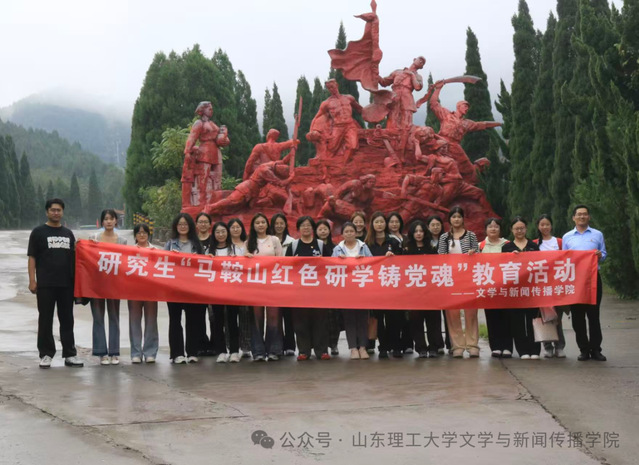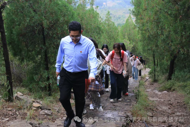 马鞍山红色教育基地位于淄川区太河镇,主峰海拔618米,是一处集雄伟山峦、抗日遗址与齐长城遗址于一体的国家文化公园,也是首批国家级抗战纪念遗址,拥有深厚的红色底蕴与丰富的教育资源。活动伊始,钟云瑞带领研究生徒步攀登马鞍山,重走抗战路,切身感受革命先辈在艰苦环境下坚守斗争的不易。