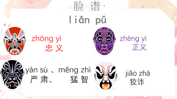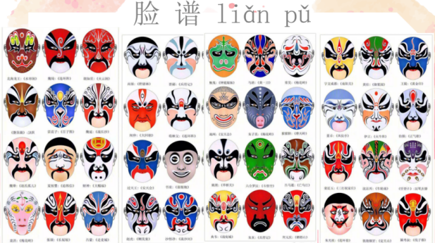 (1)用图片展示 (2)运用变装视频让员工更直观地看到国粹的魅力 (3)展示脸谱 (4)给同学们展示川剧变脸 (5)让同学们拿水彩笔画脸谱线稿 (6)从300多种脸谱中总结出不同颜色所代表的人物性格 红色:忠义 紫色:正义 白色:狡诈 黑色:严 肃 、 猛 智