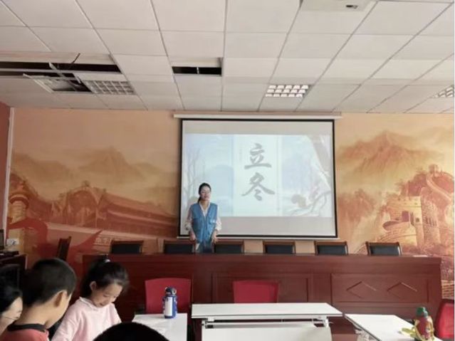 活动伊始,志愿者为孩子们介绍了立冬这一节气的历史渊源、物候特点、传统习俗与文化内涵。从“补冬”食俗到冬季养生,生动有趣的知识激发了孩子们对节气的兴趣,也让他们了解了古人顺应自然、调和身心的生活智慧。