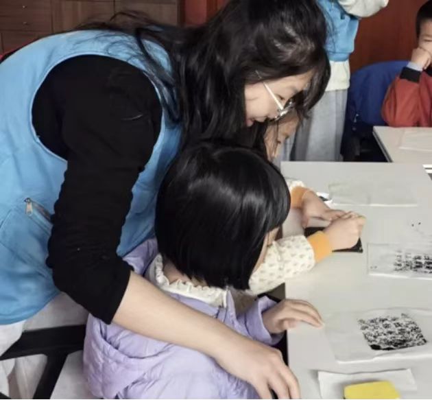 随后的“拓印”手工体验环节,志愿者为孩子们提供了刻有古诗词的拓印板,孩子们在志愿者的指导下,亲手制作出一张张独特的拓片。这亲手拓印的不仅是文字,更是对传统文化的一份直观触摸与深刻记忆。