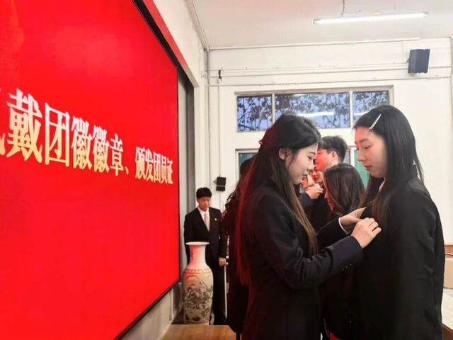 仪式在庄严的国歌声中开始。主持人宣读了新团员名单,参会老师与优秀党员代表共同为新团员佩戴团徽、颁发团员证。