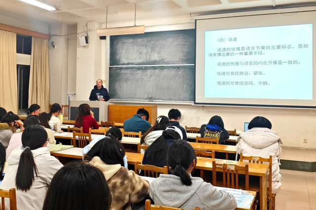 张立新老师结合诵读核心要点,围绕情感表达、声韵把控、舞台呈现等关键内容展开系统讲解。针对诵读中常见的语调平淡、情感脱节、肢体僵硬等问题,老师逐一剖析,给出具体解决思路,帮助同学们理清诵读逻辑,夯实专业基础。